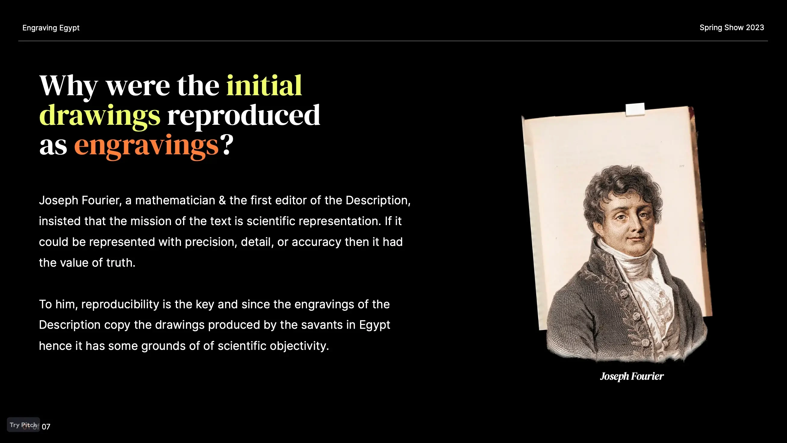 Aside from contextual printed information, positioned on the side of the main exhibition, supplementary infographics (slides) were initially designed to be printed, emulating the displays found in real-life museum exhibitions. However, considering the available space, a timed slideshow proved to be more suitable. The information is presented in bite-sized segments, emphasizing the distinctions between the original drawings and the reproduced engravings found in The Description of Egypt.