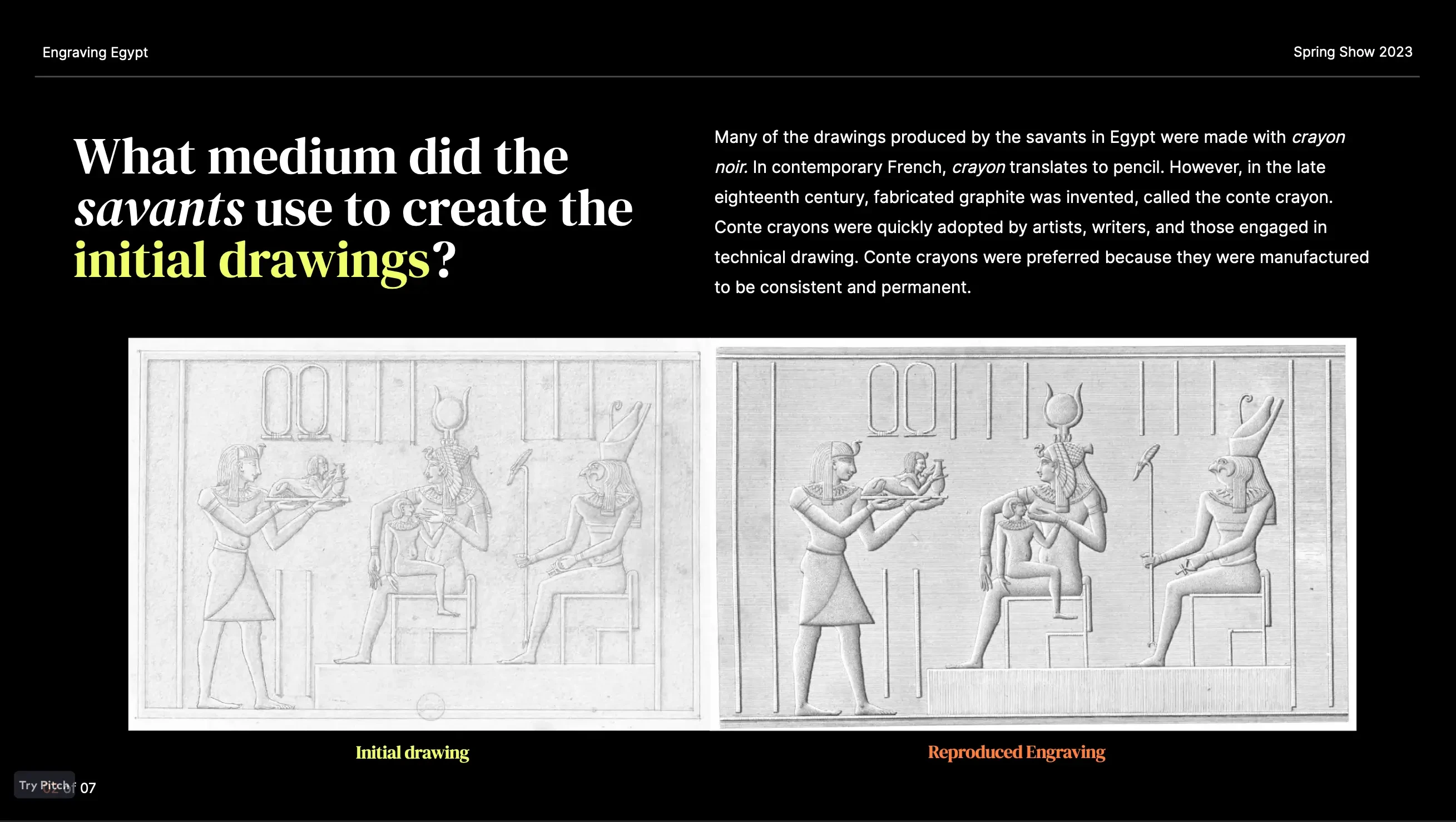 • As the Description de l’Égypte continues to influence the study of ancient Egypt, we aim to raise awareness about its Orientalist underpinnings while also discrediting its objectivity as well as highlighting Egyptian art and the techniques of engraving.