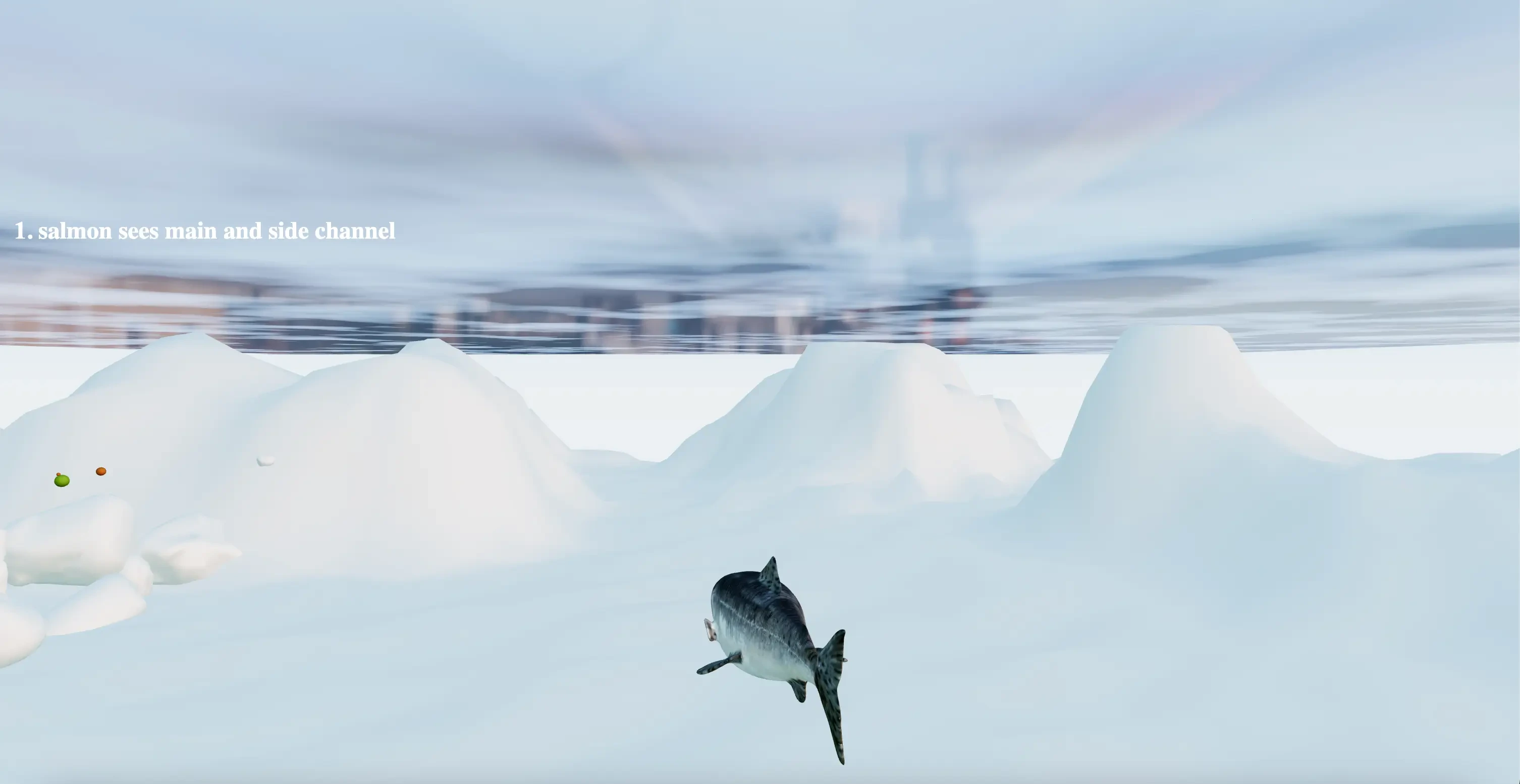 Once the project began to come together, we added highlights for the mainstem and side channel of the salmon environment and further adjust the camera movement. At this stage, we are ready to HTML and CSS for the textual elements of our article. In addition to coding the 2D intro text and ending of the article, we wanted the in-scene texts to be in a box, and the text changes as you scroll.