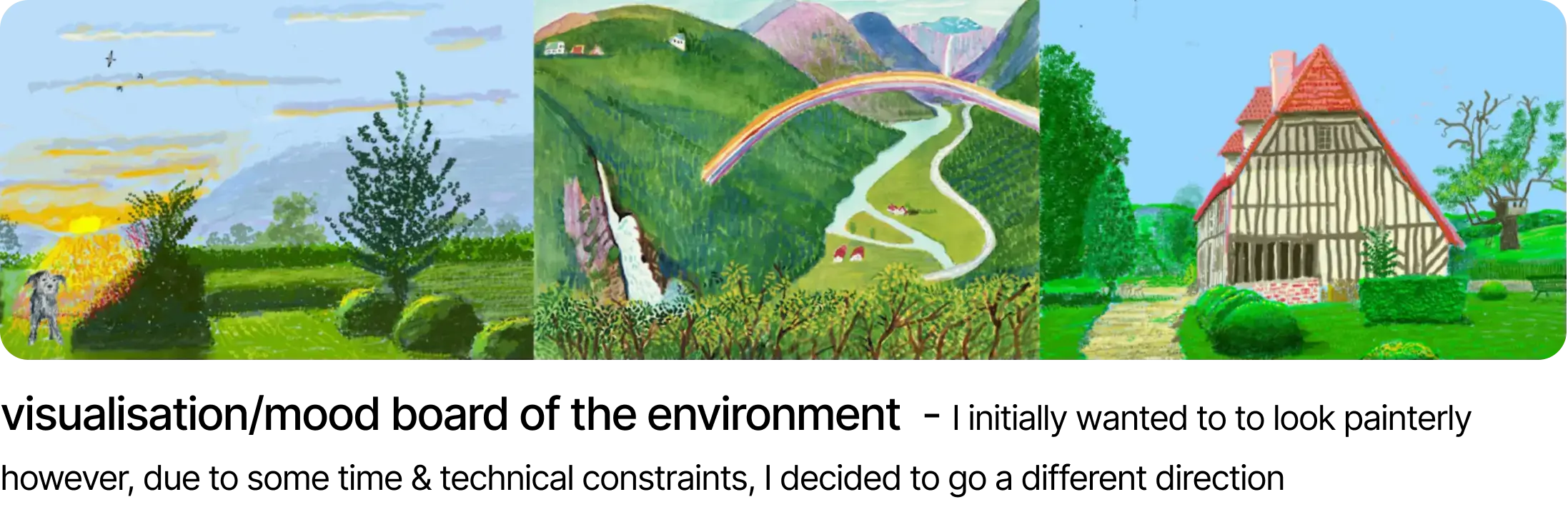 Simultaneously, I continued to develop and polish the assets, asking and collecting stories of people who have lost their pets, enriching the narratives embedded within the virtual world to ensure they resonated deeply with users, providing a comforting and hopefully, engaging experience.